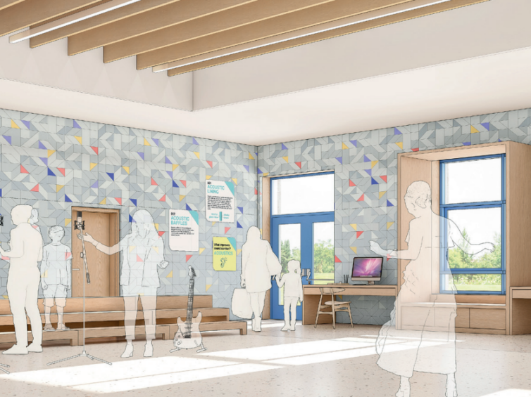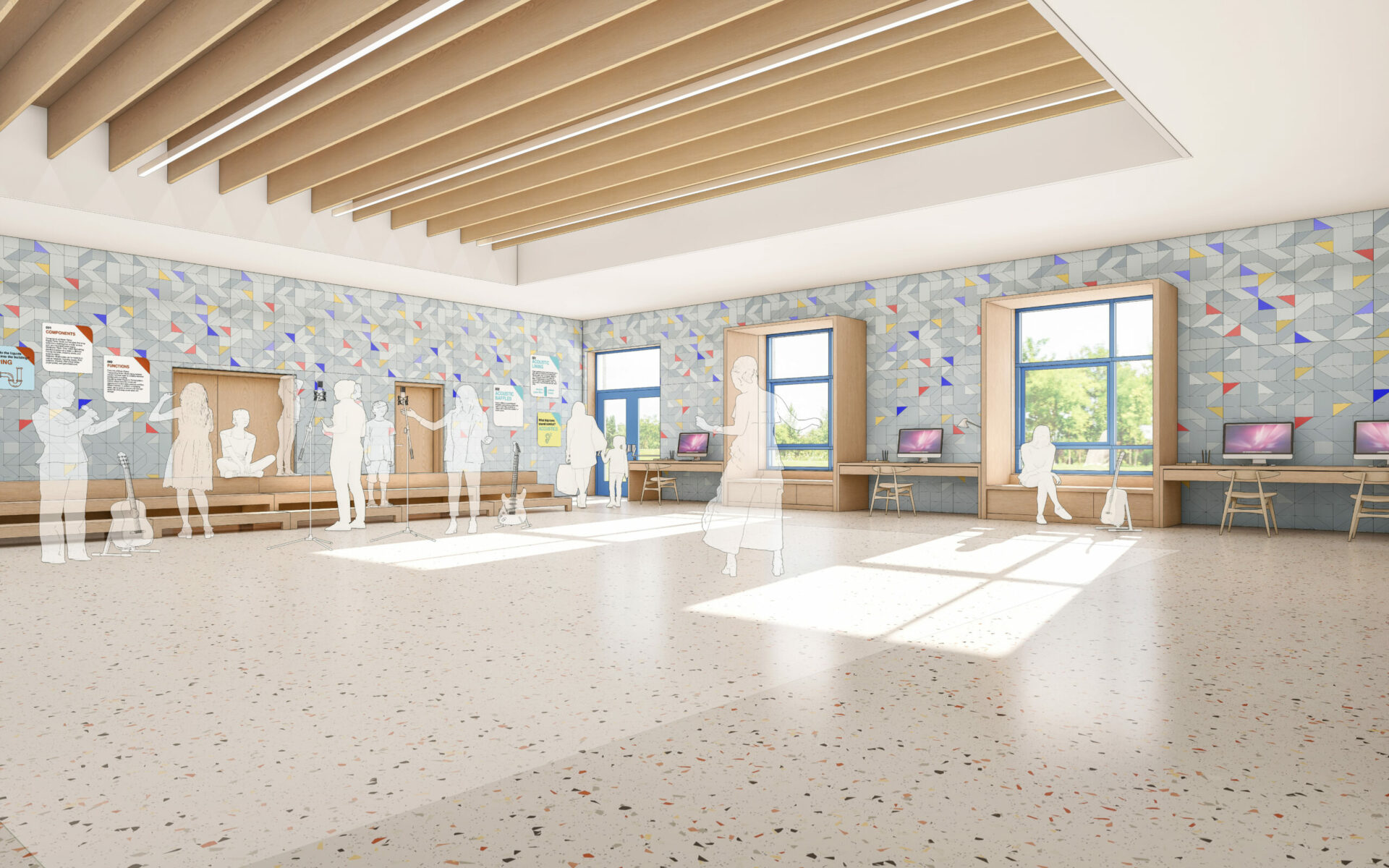For the music room: a recessed ceiling volume punctuated by longitudinal acoustic baffles that reveal the building systems above. Between the acoustic baffles, lighting fixtures are suspended, providing diffuse and uniform general lighting with high visual comfort. The walls feature micro-perforated acoustic panels enhanced with an origami-inspired pattern. Colors seem to float like notes suspended in the air, harmonizing with the regular rhythm established on the ceiling.
