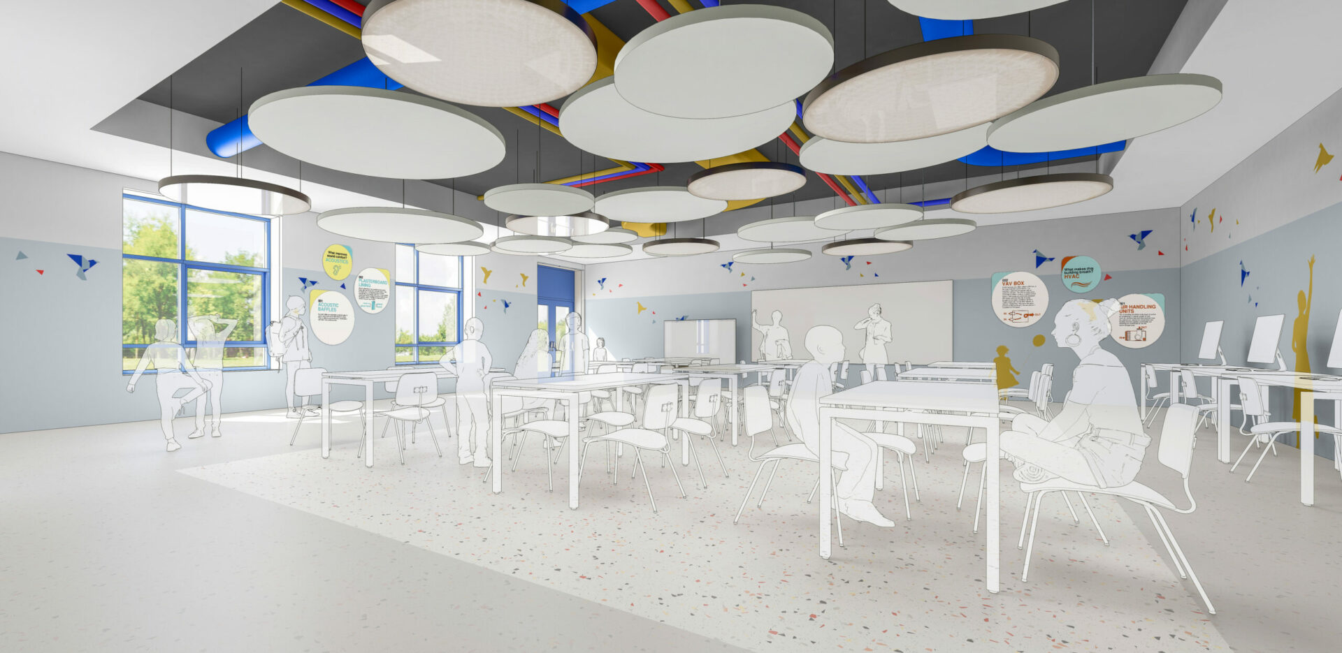 For the art room, the design is deliberately minimal on the floors and walls, but fully expressed in the ceiling: a recessed volume highlighted with a dark tone, crossed by colored ducts. Each duct, associated with a specific color, is accompanied by panels indicating what it carries (air, water, electricity, etc.), thus transforming building systems into an educational and playful element.