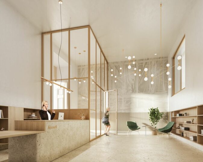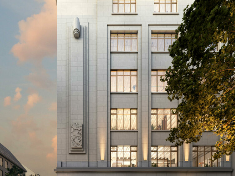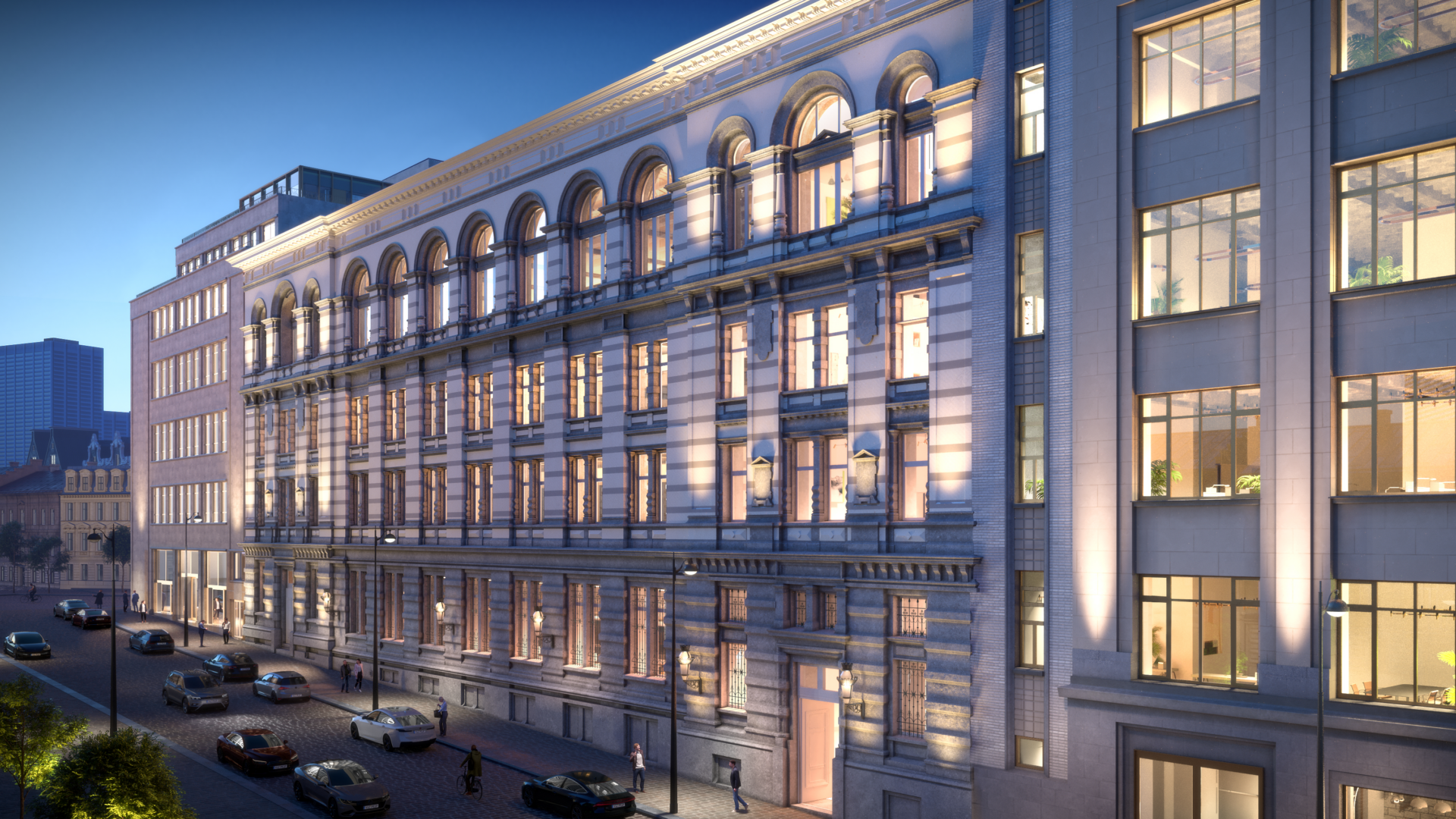 A commercial podium (2,000 sqm) will be created at the ground floor along rue Lebeau, encouraging pedestrians to move from the Sablon down toward the lower part of the city. The former Central Telephone Building, constructed in 1895 and covering a quarter of the complex’s area, will be renovated into a modern, versatile office building (25,470 sqm). The building will regain its original grandeur while preserving its magnificent façades and historic staircases.