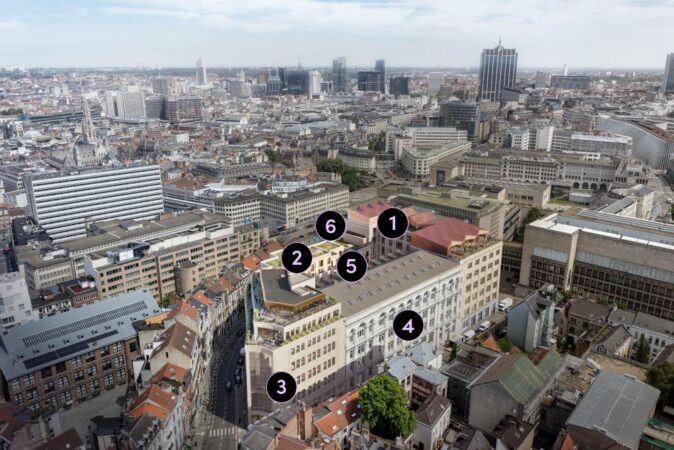 1. ‘Justice’: offices 2. ‘Lebeau’: residential 3. ‘Sablon’:offices 4. ‘Paille’: offices 5. ‘The Parc’: shared garden 6. Parking
